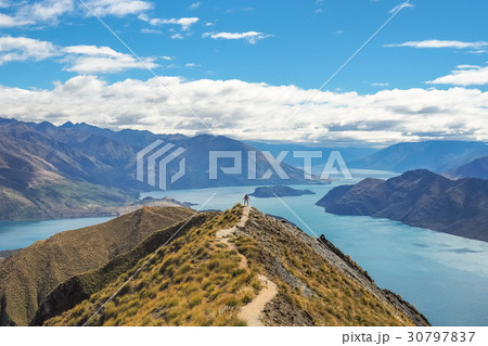 Aerial view of Roys Peak with Lake Wanaka in New Zealand.