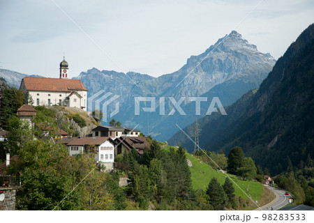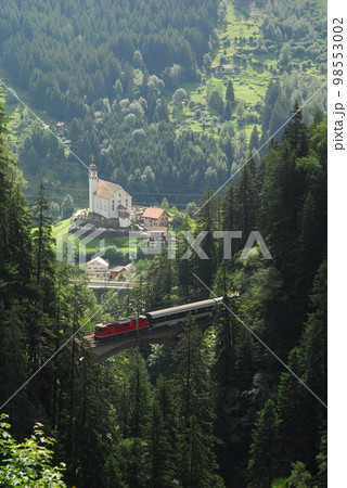 ヴァッセンの教会を背景にゴッタルド峠越えをするスイス国鉄の列車