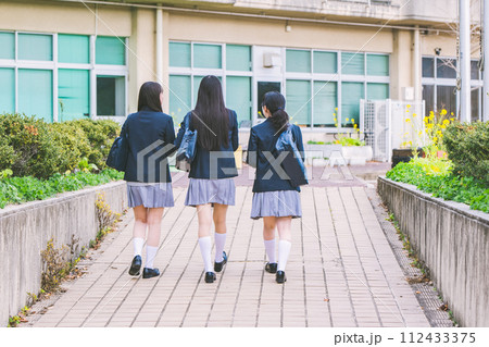 学校の廊下を歩く友達の後ろ姿(制服姿の小学生・中学生・高校生・女子高生)