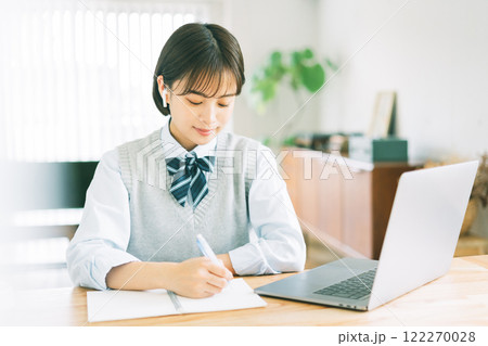 パソコンを見ながら勉強をする女の子 高校生 中学生