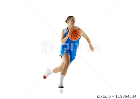 Sportive woman in blue basketball jersey dribbling in motion against white studio background. Female sportsman.