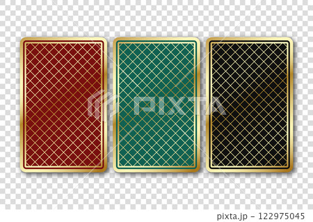 Three beautiful playing cards. The backside cards are green, red and black. Vector illustration on a transparent background.