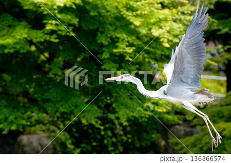 新緑の背景を羽ばたくアオサギ