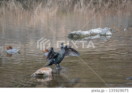 羽を広げるカワウ 京都市鴨川