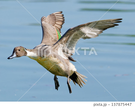 水面を飛ぶオナガガモ