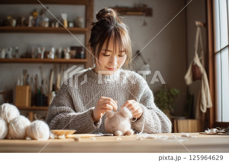 羊毛フェルトで羊のぬいぐるみを作る日本人女性
