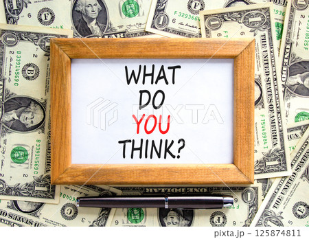 What do you think symbol. Concept words What do you think on beautiful wooden picture frame. Black pen. Beautiful background from dollar bills. Business and What do you think concept. Copy space.