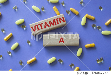 Vitamin A symbol. Concept word Vitamin A on wooden blocks. Beautiful purple background with pills. Medicine and Vitamin A concept. Copy space