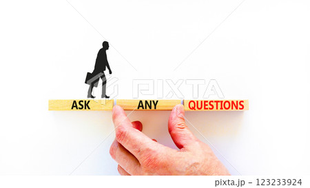 Ask any questions symbol. Concept words Ask any questions on beautiful wooden blocks. Beautiful white background. Businessman hand. Business ask any questions concept. Copy space.