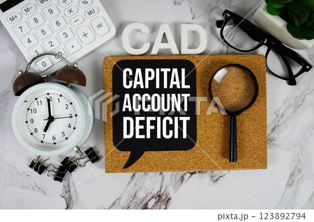 CAD - Capital Account Deficit acronym with calculator, alarm clock and magnifying glass, business concept background