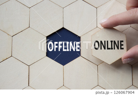Offline or Online symbol. Concept word Offline or Online on wooden comb puzzle. Businessman hand. Beautiful deep blue background. Business and Offline or Online concept. Copy space