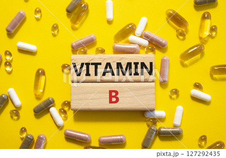 Vitamin B symbol. Concept word Vitamin B on wooden blocks. Beautiful yellow background with pills. Medicine and Vitamin B concept. Copy space